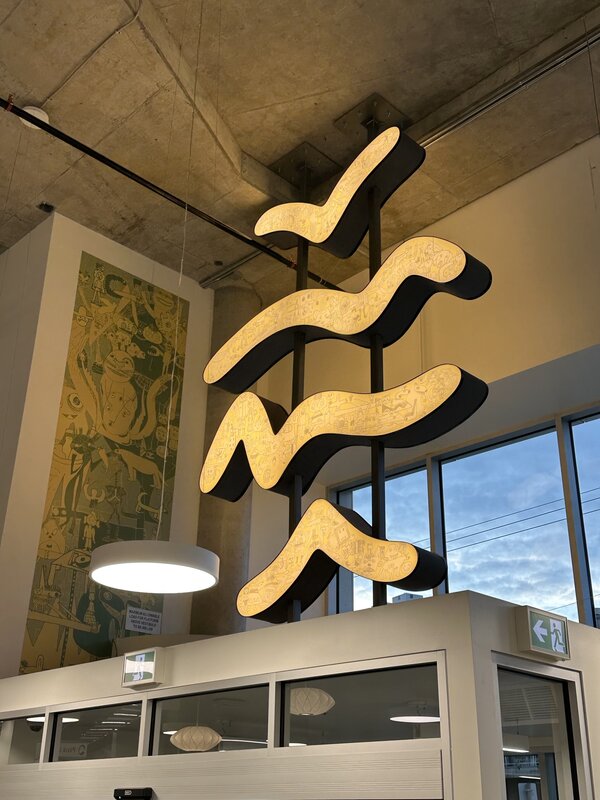 sxʷeŋxʷəŋ təŋəxʷ James Bay Branch Library art installation "Drawing Branches." Completed during Luke Ramsey’s Artist in Residence program with the City of Victoria. In the summer and fall of 2018, Luke Ramsey hosted drop-in drawing sessions with local youth. Together they created drawings which took shape like branches on a tree. Within each shape is a collage selection of these drawings, best to be seen in person. Large collaborative print on the wall. Light box installation represents a collection of drawing gestures that creates the whole, and showcases the creativity and collaboration of youth in the community. Built and installed by SEEN Signs.